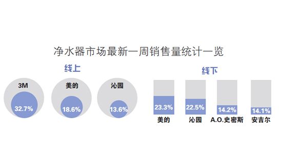 此外,盡管凈水器品牌眾多,但市場集中度正在進一步加強,少數(shù)品牌廠商分走了大部分市場蛋糕。據(jù)第三方機構(gòu)中怡康最新一周的監(jiān)測數(shù)據(jù)顯示,在第42周(10月10日-16日)的凈水器線上銷售量統(tǒng)計中,3M占據(jù)了32.7%的市場份額,美的18.6%、沁園13.6%緊跟其后;在線下零售量中,美的以23.3%的市場份額領(lǐng)跑,其后是沁園22.5%、A.O.史密斯14.2%、安吉爾14.1%。